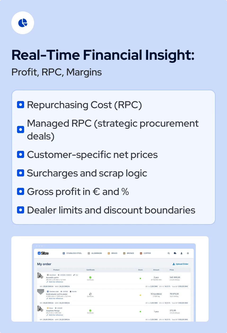 - Dynamic Pricing Engine: Net prices, cutting fees, scrap logic, customer agreements, and surcharges calculated in milliseconds.